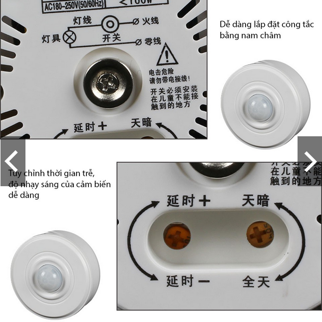 Bật tắt bóng đèn hành lang chung cư hiên nhà tự động cho phép cài đặt thời gian tự tắt sau khi bật đèn, và cài đặt độ nhạy của thiết bị.