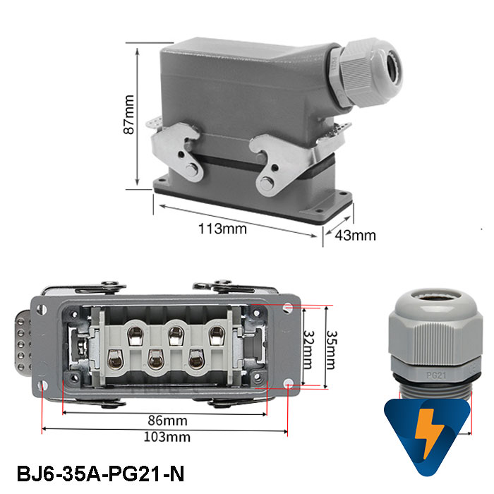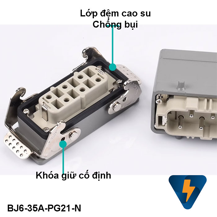 Bộ giắc cắm công nghiệp 6 chân 35A vỏ bọc bên ngoài bằng nhôm sơn tĩnh điện ứng dụng kết nối tín hiệu điều khiển trong các máy móc công nghiệp. Bộ giắc cắm công nghiệp 6 chân 35A được thiết kế sử dụng trong môi trường công nghiệp hoạt động bền bỉ liên tục cấp độ bảo vệ IP65. Bộ giắc cắm công nghiệp 6 chân 35A có các khớp kết nối với nhau bằng cao su, nên hoàn toàn kín nước và kín bụi khi liên kết lại với nhau, đồng thời dễ dàng tháo lắp khi có nhu cầu.
