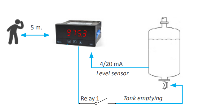 Ứng dụng trong việc điều khiển mức chất lỏng, cảm biến đo mức chất lỏng sẽ truyền tín hiệu 4~20 mA về bộ hiện thị tương đương với mức chất lỏng từ thấp nhất đến cao nhất.