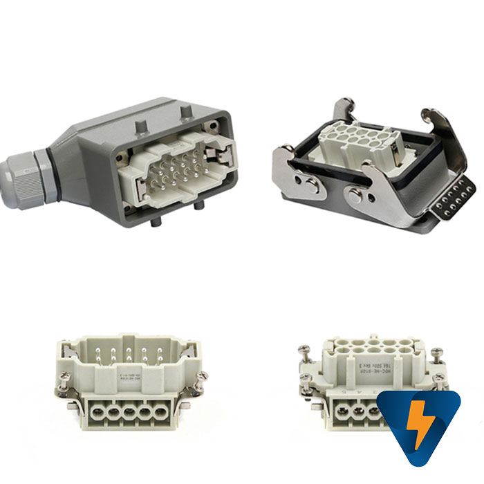 Bộ kết nối dây điện 10 chân 16A vỏ bọc bên ngoài bằng nhôm sơn tĩnh điện ứng dụng kết nối tín hiệu điều khiển trong các máy móc công nghiệp. Bộ kết nối dây điện 10 chân 16A được thiết kế sử dụng trong môi trường công nghiệp hoạt động bền bỉ liên tục cấp độ bảo vệ IP65. Bộ kết nối dây điện 10 chân 16A có các khớp kết nối với nhau bằng cao su, nên hoàn toàn kín nước và kín bụi khi liên kết lại với nhau, đồng thời dễ dàng tháo lắp khi có nhu cầu.