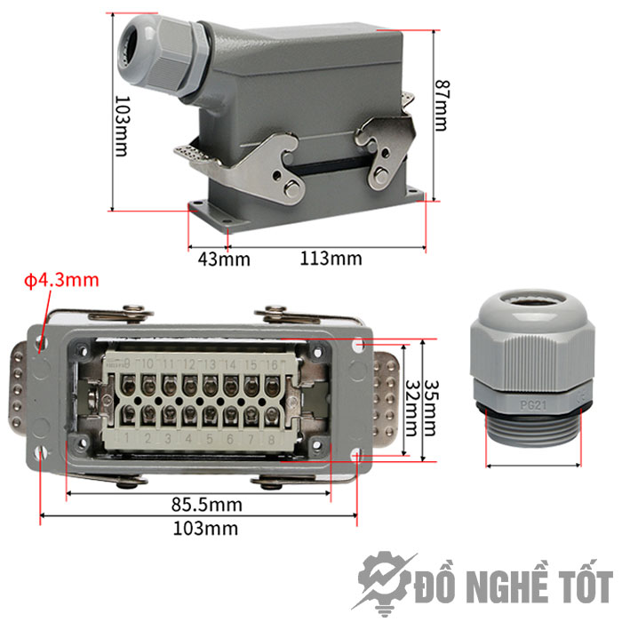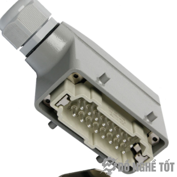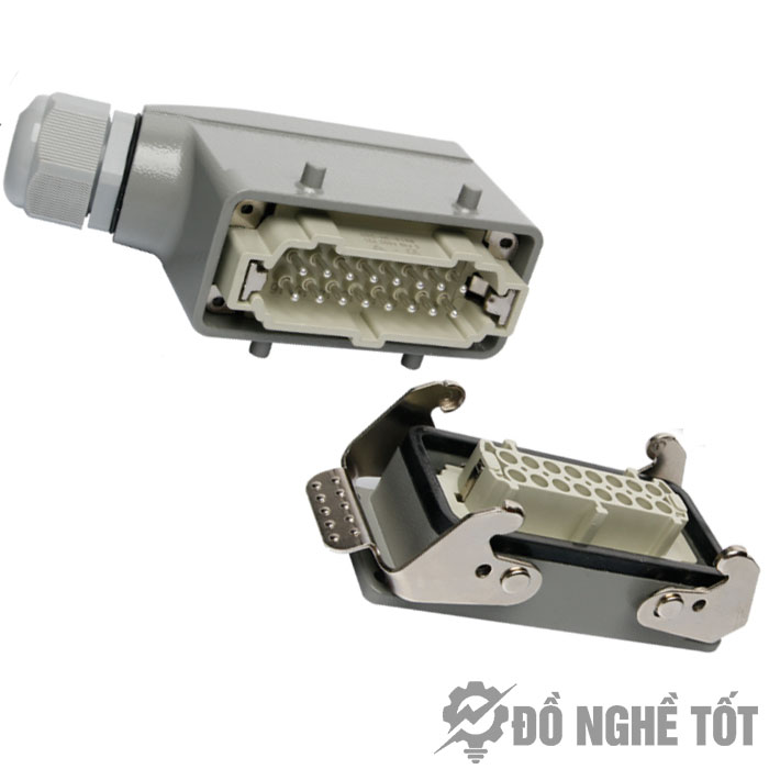 Bộ kết nối dây điện 16 chân 16A vỏ bọc bên ngoài bằng nhôm sơn tĩnh điện ứng dụng kết nối tín hiệu điều khiển trong các máy móc công nghiệp. Bộ kết nối dây điện 16 chân 16A được thiết kế sử dụng trong môi trường công nghiệp hoạt động bền bỉ liên tục cấp độ bảo vệ IP65. Bộ kết nối dây điện 16 chân 16A có các khớp kết nối với nhau bằng cao su, nên hoàn toàn kín nước và kín bụi khi liên kết lại với nhau, đồng thời dễ dàng tháo lắp khi có nhu cầu.