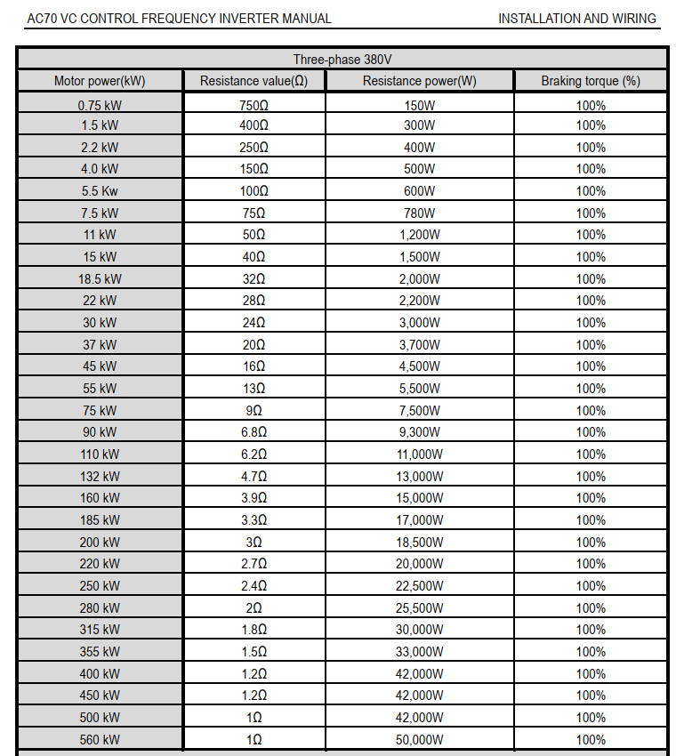 Tham khảo bảng lựa chọn điện trở xả kết nối với biến tần dòng AC70 thương hiệu biến tần Veichi