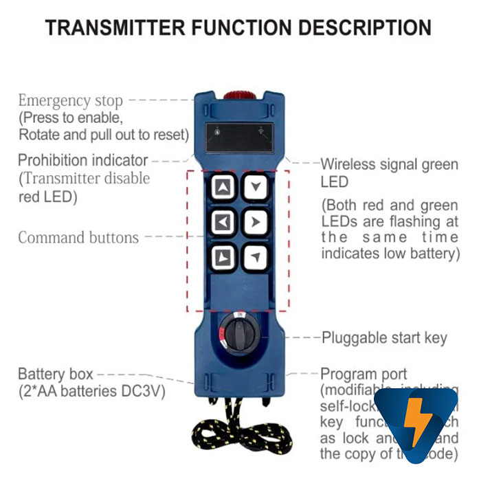 Điều khiển từ xa GOTI chống nước IP65 bao gồm 6 nút bấm điều khiển, 1 nút dừng khẩn cấp, với thiết kế nhỏ gọn trọng lượng cả bộ thu và phát chưa đến 1000 gam. Điều khiển từ xa GOTI chống nước IP65 dễ dàng sử dụng cho tất cả người dùng.