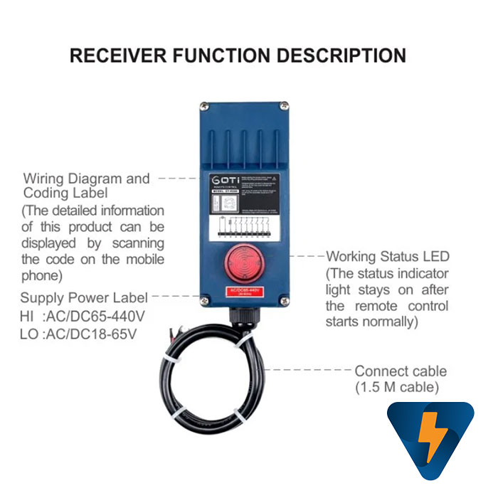 Điều khiển từ xa GOTI chống nước IP65 GT-RS06 bao gồm 6 nút bấm điều khiển, 1 nút dừng khẩn cấp, với thiết kế nhỏ gọn trọng lượng cả bộ thu và phát chưa đến 1000 gam. Điều khiển từ xa GOTI chống nước IP65 GT-RS06 dễ dàng sử dụng cho tất cả người dùng.