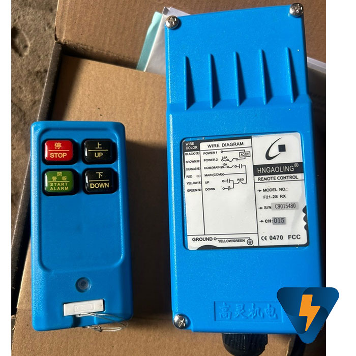 Điều khiển từ xa HNGAOLING F21-2S RX, với bộ thu sử dụng nguồn điện AC , còn tay bấm di chuyển dùng 2 viên pin AA.