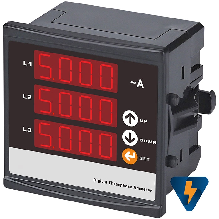 Đồng hồ Ampe bộ đo dòng điện 3 pha được thiết kế để giám sát đồng thời dòng điện ba pha, giúp kiểm tra trạng thái dòng điện và tìm ra dòng điện mất cân bằng giữa các pha. Đồng hồ Ampe bộ đo dòng điện 3 pha không cần sử dụng chuyển mạch, đấu nối nhanh, và tăng tính thẩm mỹ cho tủ điện.