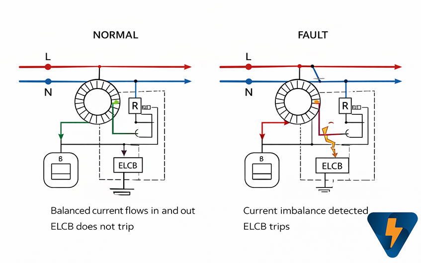 ELCB cũng giống như một loại rơ le điện. Ở các tòa nhà, nguồn điện lưới của nó sẽ được kết nối đến các tiếp điểm chuyển mạch. Khi đó, cầu dao sẽ ngắt điện nếu phát hiện có tình trạng rò rỉ đất. Như vậy, thiết bị đóng cắt này sẽ có thể bảo vệ hoàn hảo cho người dùng điện khi phát hiện có sự cố phát sinh trong thời gian nhanh nhất.