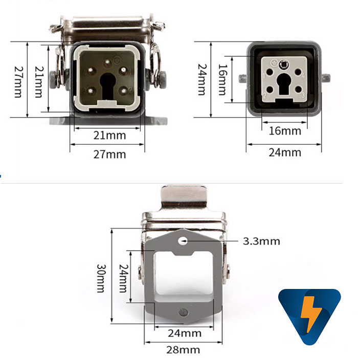 Giắc cắm (jack cắm) 5 chân 10A vuông kiểu góc vuông vỏ bọc bên ngoài bằng nhôm sơn tĩnh điện ứng dụng kết nối tín hiệu điều khiển trong các máy móc công nghiệp. Cổng nối trung gian 5 chân, đầu nối trung gian cho cảm biến, đầu nối trung gian máy nhiệt...