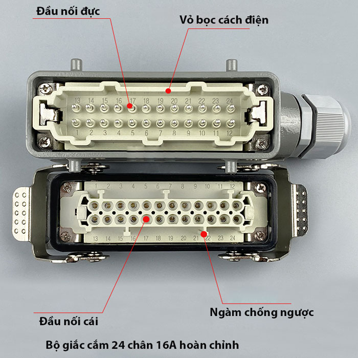 Giắc cắm (jack cắm) phích cắm 24 chân 16A HDC-HE-024-F HDC-HE-024-M vỏ bọc bên ngoài bằng nhôm sơn tĩnh điện ứng dụng kết nối tín hiệu điều khiển trong các máy móc công nghiệp. Giắc cắm (jack cắm) phích cắm 24 chân 16A HDC-HE-024-F HDC-HE-024-M được thiết kế sử dụng trong môi trường công nghiệp hoạt động bền bỉ liên tục cấp độ bảo vệ IP65. Giắc cắm (jack cắm) phích cắm 24 chân 16A HDC-HE-024-F HDC-HE-024-M có các khớp kết nối với nhau bằng cao su, nên hoàn toàn kín nước và kín bụi khi liên kết lại với nhau, đồng thời dễ dàng tháo lắp khi có nhu cầu.