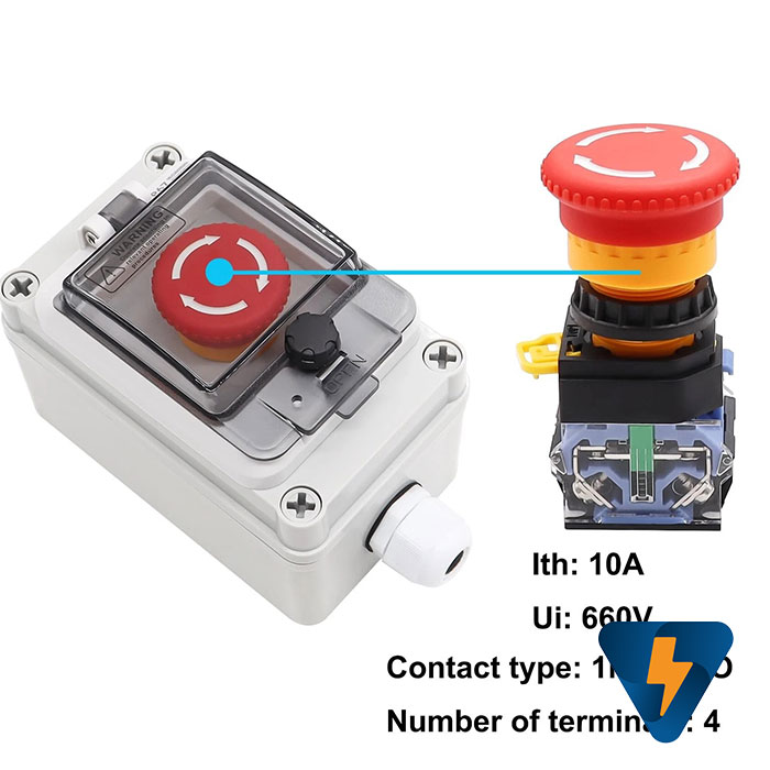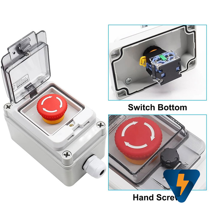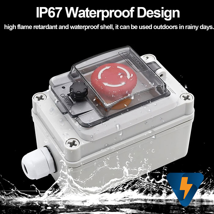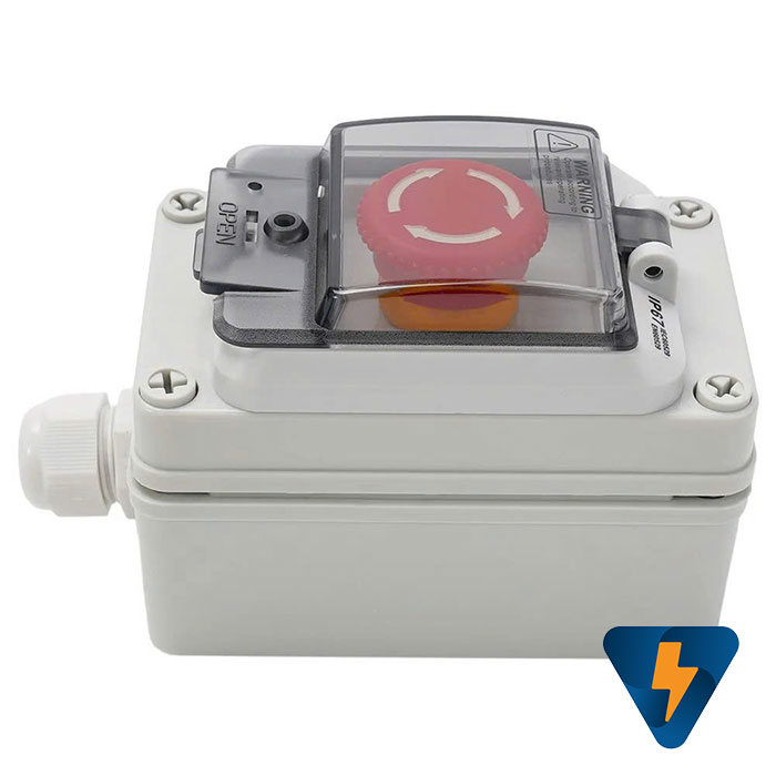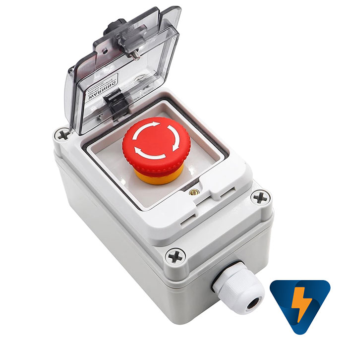 Hộp công tắc nút nhấn báo cháy, ngắt điện năng lượng mặt trời, trạm sạc xe điện chống nước. phù hợp lắp đặt cho những khu vực cần thao tác dừng khẩn cách xa bảng điều khiển trung tâm, ngoài ra hộp nút nhấn khẩn cấp còn được tích hợp nắp che bằng nhựa trong hạn chế các trường hợp dừng máy không cần thiết như ( va quệt,..), cove trắng trong dễ dàng phân biệt, dễ dàng thao tác khẩn cấp khi máy có sự cố
