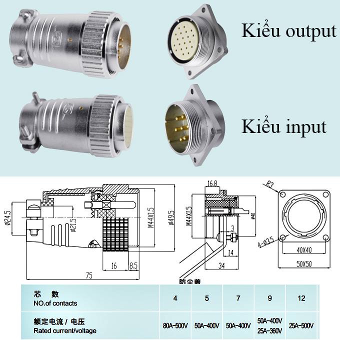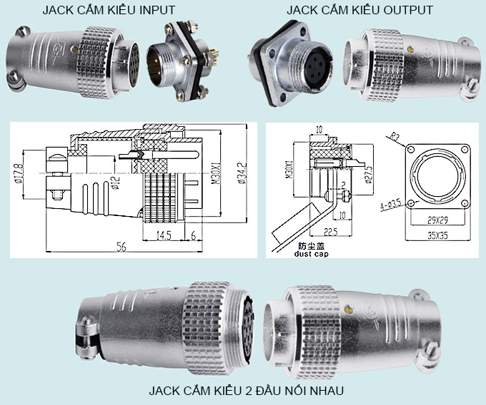 - Ổ cắm điện 10 chân, 3 chân, 4 chân, 5 chân, 6 chân, 7 chân, 8 chân, 9 chân, 10, 11, 12, 14, 15. Các loại rắc 12 chân, 13 chân, 14 chân, 15 chân, 16 chân, 17 chân, 18 chân, 19 chân. Loại giắc 20 chân, 21 chân, 22 chân, 23 chân, 24 chân, 25 chân, 26 chân, 27, 32 chân, 37 chân, 64 chân. Jack cắm điện ngoài trời kín nước.