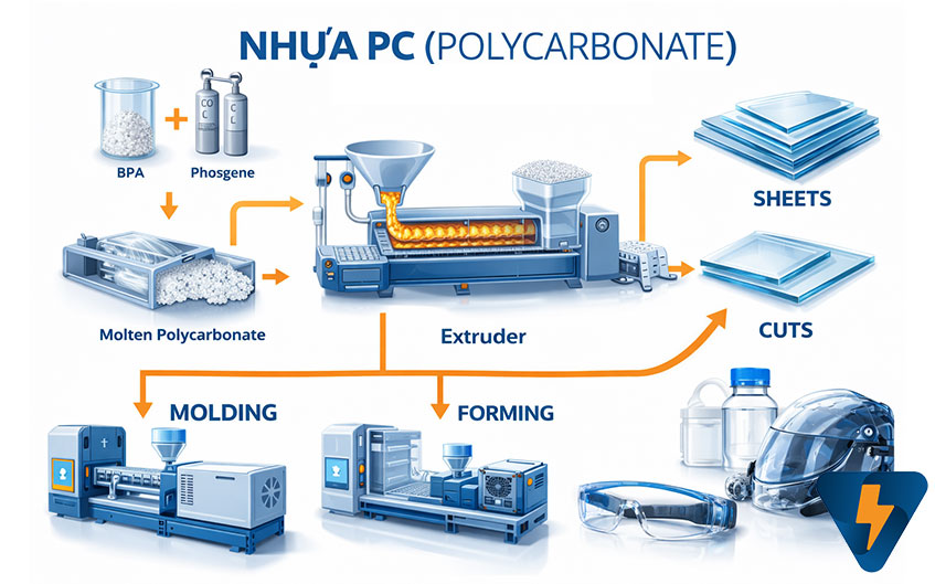 Bắt đầu từ việc kết hợp các nguyên liệu chính như bisphenol A (BPA) và phosgene thông qua phản ứng trùng hợp. Công nghệ sản xuất hiện đại đã giúp tối ưu hóa quy trình này, cho phép tạo ra polycarbonate với chất lượng cao và ổn định hơn. Sản phẩm cuối cùng có thể được chế biến thành nhiều hình dạng khác nhau như tấm, ống hoặc hạt để phục vụ cho nhiều ứng dụng khác nhau.