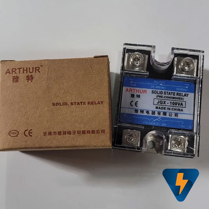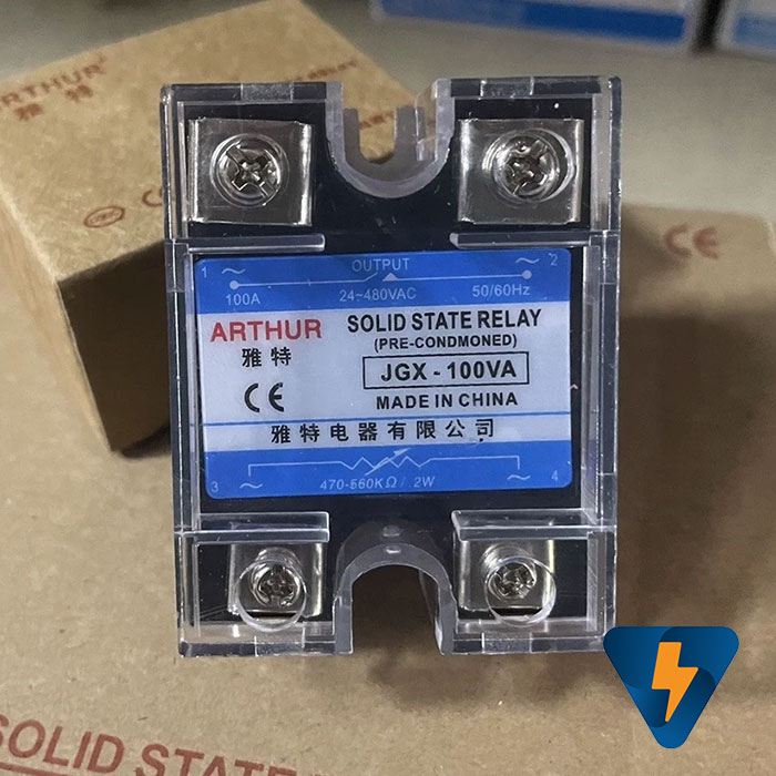 - Rơ le bán dẫn SSR JGX-100VA Arthur, đóng van trò là bộ điều khiển công suất, thường dùng cho các loại tải trở bóng đèn, sợi đốt nóng, tín hiệu điều khiển là biến trỏ 500k, điện áp đầu ra 24-380 VAC, dòng điện chịu tải 100A tải trở