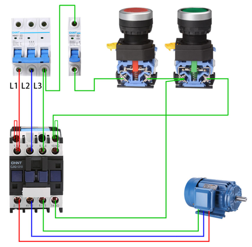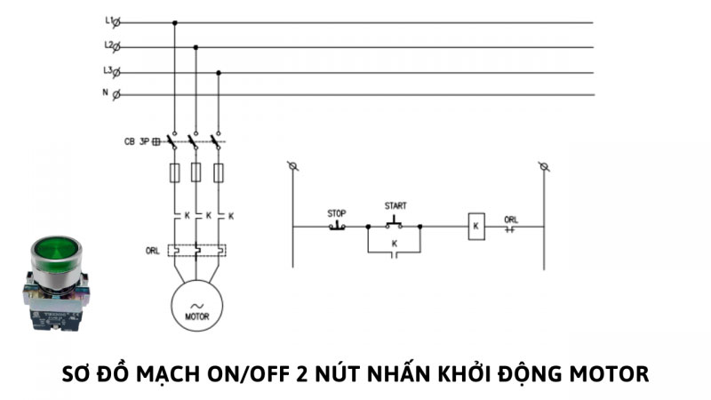 Ví dụ một sơ đồ mạch on off 2 nút nhấn để khởi động motor: